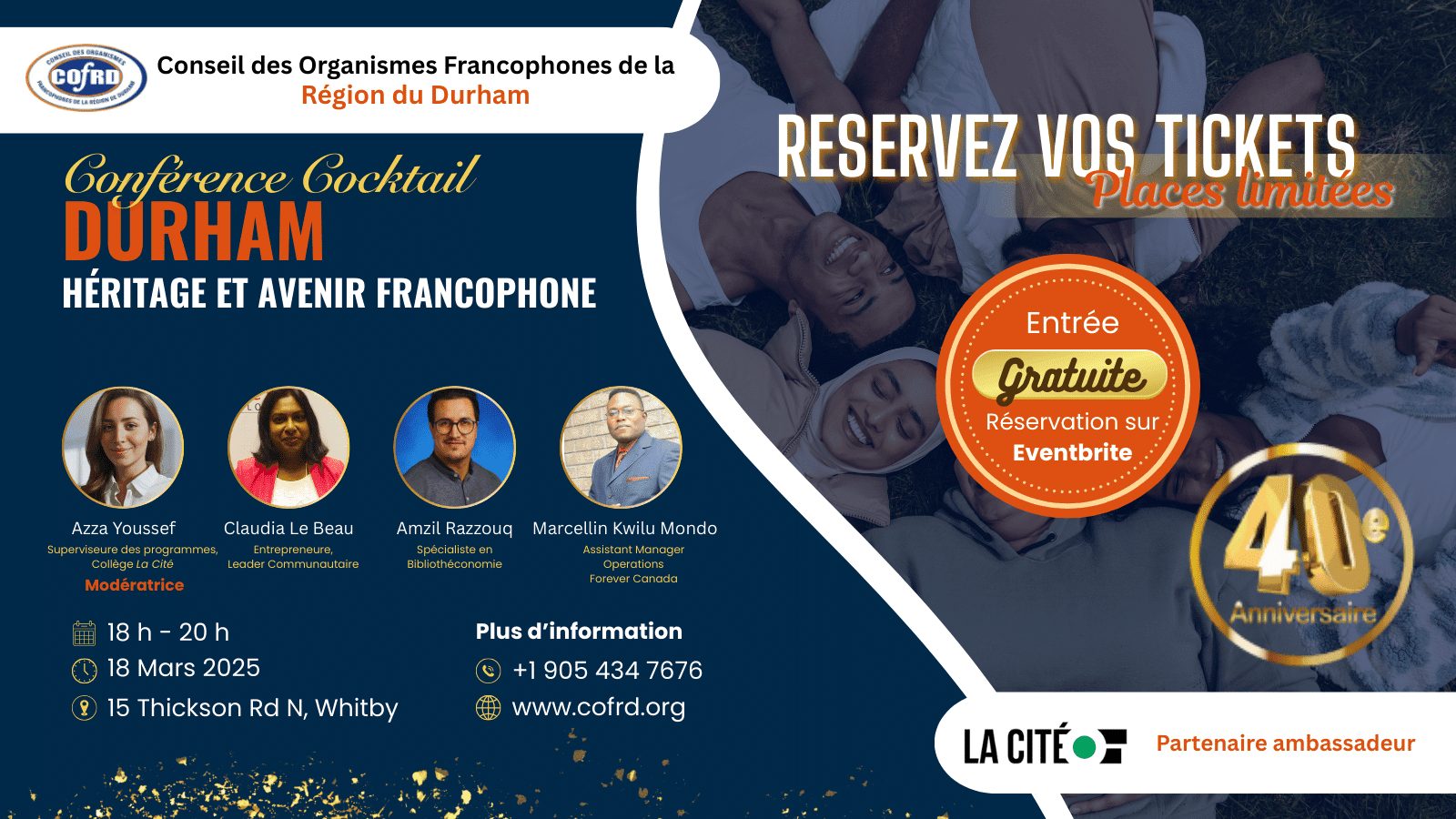 À l'Amicale - Centre Communautaire Francophone de Durham 15, Rue Thickson Nord, Whitby, Ontario, CanadaConférence - cocktail Thème : Durham : Héritage et Avenir Francophone Ce rendez-vous est un incontournable pour vous. Durant cette conférence nous explorerons ensemble l'héritage et l'avenir de la communauté francophone à Durham. Rejoignez-nous pour une discussion enrichissante et des échanges passionnants sur l'importance de préserver notre culture et notre langue. Ne manquez pas cette […]